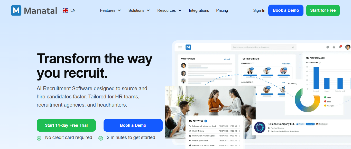 Manatal is modern recruitment software built for both hiring agencies and internal HR teams. It helps recruiters identify the best candidates quickly using AI-based matching and social media data. By automating candidate screening, Manatal saves recruiters valuable time and improves hiring decisions. It also combines CRM and ATS functions, making it a strong alternative to Greenhouse for companies seeking an integrated hiring tool.