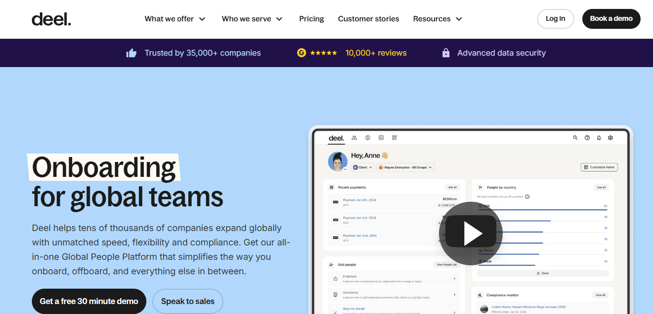 Deel is an all-in-one HR platform designed for businesses with global teams. It helps companies manage payroll, handle contractors, and operate as an Employer of Record in multiple countries. The platform also includes employee performance tools like 360-degree reviews and goal tracking to promote team growth and accountability. Deel is especially useful for companies hiring internationally, offering automated payroll and compliance support across different regions.