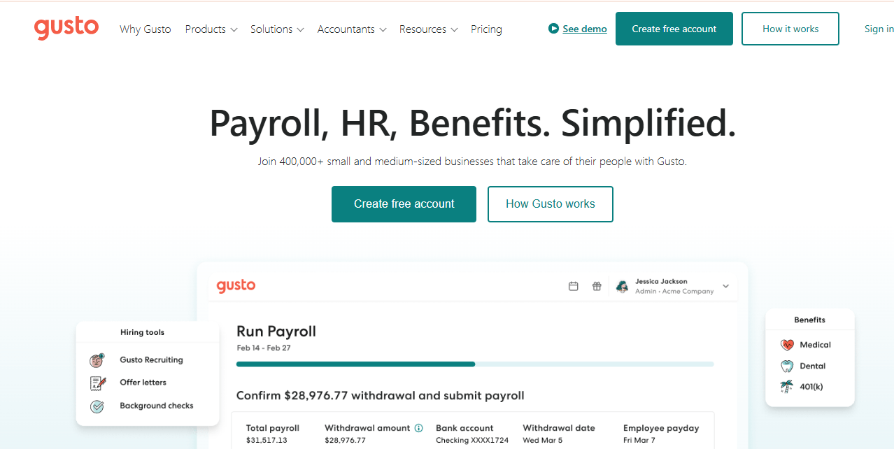 - Easy-to-use interface that helps small businesses manage payroll, benefits, and taxes from one place