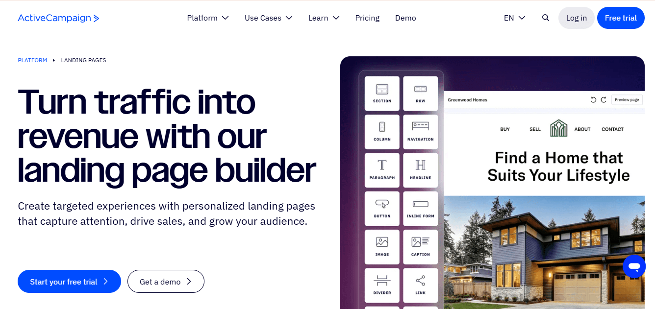 ActiveCampaign combines email marketing, CRM, and marketing automation tools for online businesses. It enables users to create landing pages, test offers, and manage marketing campaigns efficiently. As an alternative to Unbounce, ActiveCampaign’s landing page builder uses a drag-and-drop editor that allows users to design high-performing pages focused on conversions and lead generation.
