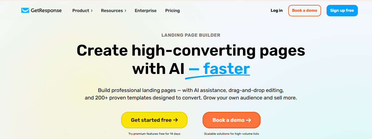 GetResponse provides a landing page builder that helps you design high-converting pages and funnels quickly. Its drag-and-drop interface makes it easy to create pages, while the library of customizable templates allows flexibility in design. You can run A/B tests, monitor performance with built-in analytics, and adjust optimization settings to improve results. Unlike landing page tools that only handle page creation, GetResponse also includes email marketing, webinar hosting, and e-commerce tools making it a single platform for capturing leads, nurturing them, and driving conversions.