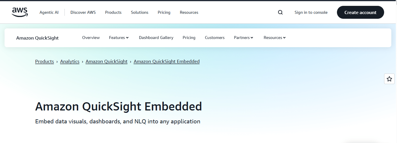 AWS QuickSight offers a cloud-native business intelligence and embedded analytics directly within AWS environments. It connects to multiple data sources such as Amazon Redshift, Amazon Athena, Amazon S3, and Presto, enabling teams to access and fetch data with ease. Developers can embed interactive dashboards and create modern paginated reports. The platform also supports natural language queries, allowing users to generate analytical insights without writing complex code.