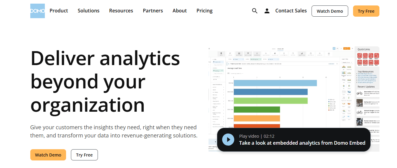 Domo provides embedded analytics tools that allow organizations to place data-driven insights directly inside their applications, partner programs, and workflows. Its customizable dashboards, real-time data updates, and built-in security make it possible to integrate analytics without relying on separate systems. The platform stands out for its simple interface, which helps non-technical users build dashboards and uncover insights quickly. Teams can also create and deploy custom data apps with minimal effort.