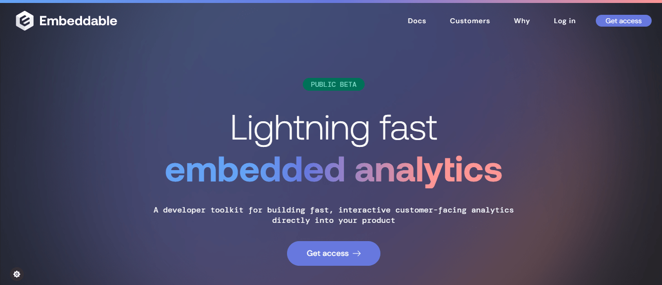 Embeddable is a developer toolkit that helps you build customer-facing analytics experiences faster than traditional methods. It works as a JavaScript SDK for businesses that want to integrate advanced analytics into their platforms. The toolkit combines the adaptability of custom-built software with the ease of business intelligence tools.