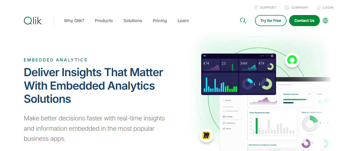 Qlik embedded analytics bring interactive dashboards and reports directly into applications. Its associative data model makes data exploration intuitive, while in-memory processing ensures fast performance. The platform integrates visual insights into end-user workflows, helping teams uncover patterns and relationships across datasets without switching tools.