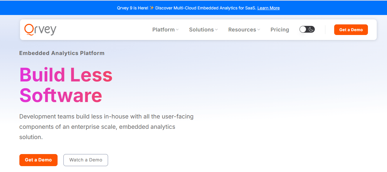 Qrvey positions itself as a leading embedded analytics platform built for SaaS providers. It takes a no-code, API-first approach that allows product teams to integrate analytics directly into their applications. Qrvey deploys entirely inside customer cloud environments, giving SaaS businesses full control while reducing development, deployment, and long-term maintenance costs.