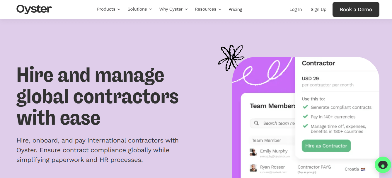 Oyster HR is a global employment platform that helps businesses hire, onboard, and pay international contractors and employees in over 180 countries. It focuses on legal compliance, clear pricing, and an easy-to-use self-service interface. Oyster HR combines contractor management and employer-of-record (EOR) services, allowing companies to manage remote and distributed teams efficiently.