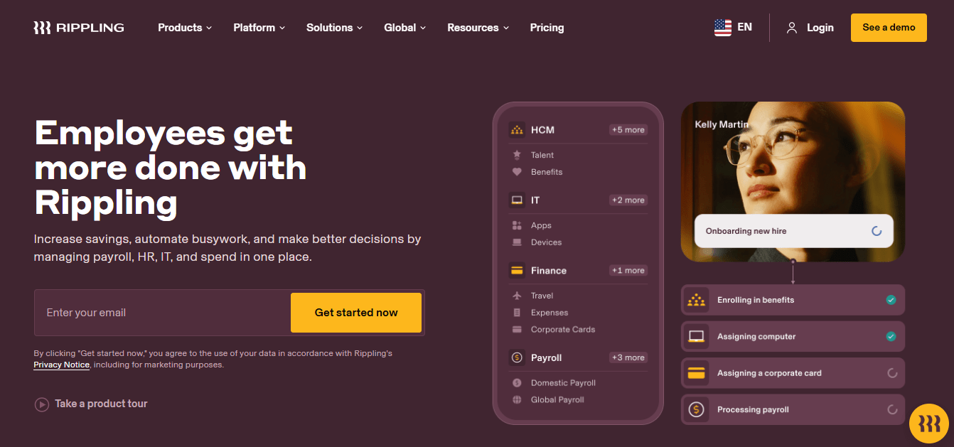 Rippling stands out as one of the best alternatives to Deel. It combines global Employer of Record (EOR), payroll, HR, and IT management in a single connected platform. Unlike Deel, which often depends on third-party tools, Rippling is built to work seamlessly across all functions, enabling businesses to manage every stage of the employee journey with accurate and consistent data.